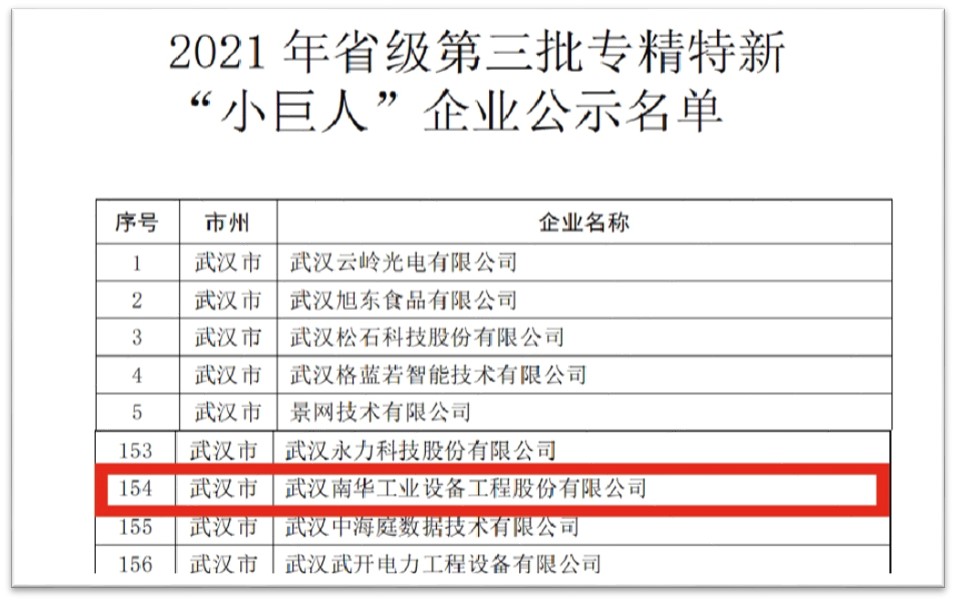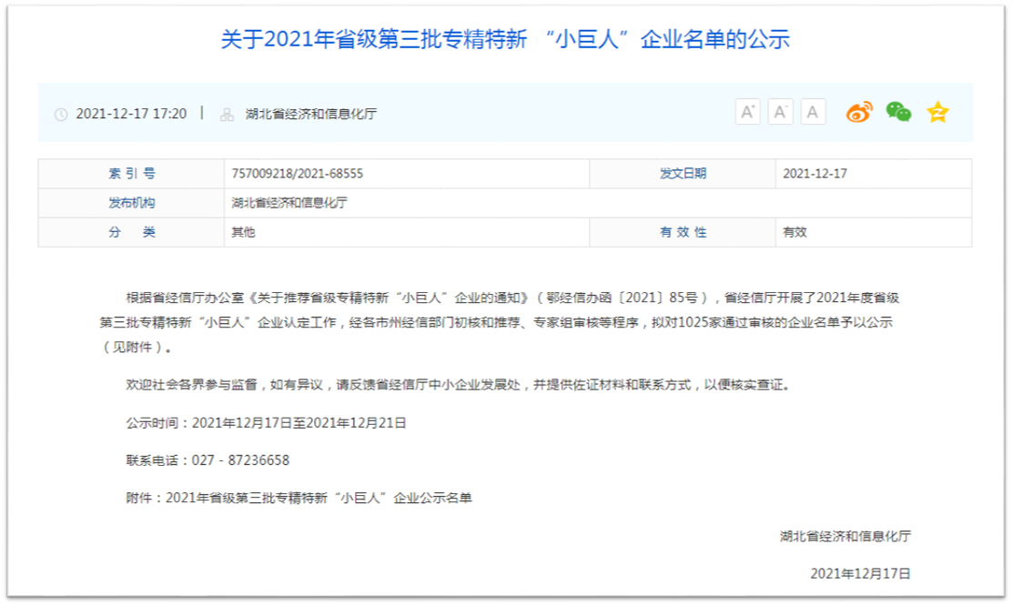 12月17日,湖北省经信厅公示了2021年省级第三批专精特新 “小巨人”企业名单,太阳成集团tyc122ccvip名列其中,成功入选湖北省专精特新 “小巨人”企业。